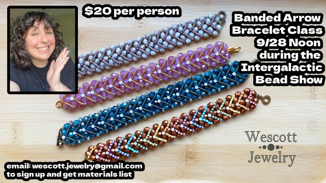 And then on Sunday, September 28th, I will be teaching my new Banded Arrow Bracelet! This is slightly more of an intermediate class, but a determined beginner will definitely be able to follow along. This is a new design that I have never taught before and I am so excited to share it with you. It’s an embellished right-angle-weave design that works up surprisingly quickly because of the larger size of the base beads and has a lot of style versatility with different bead choices. We will be starting this one also at noon so that you can get to the bead show early to shop ahead of time if you’d like. The class fee is also $20 and I will also be providing you with a printed pattern to take home.