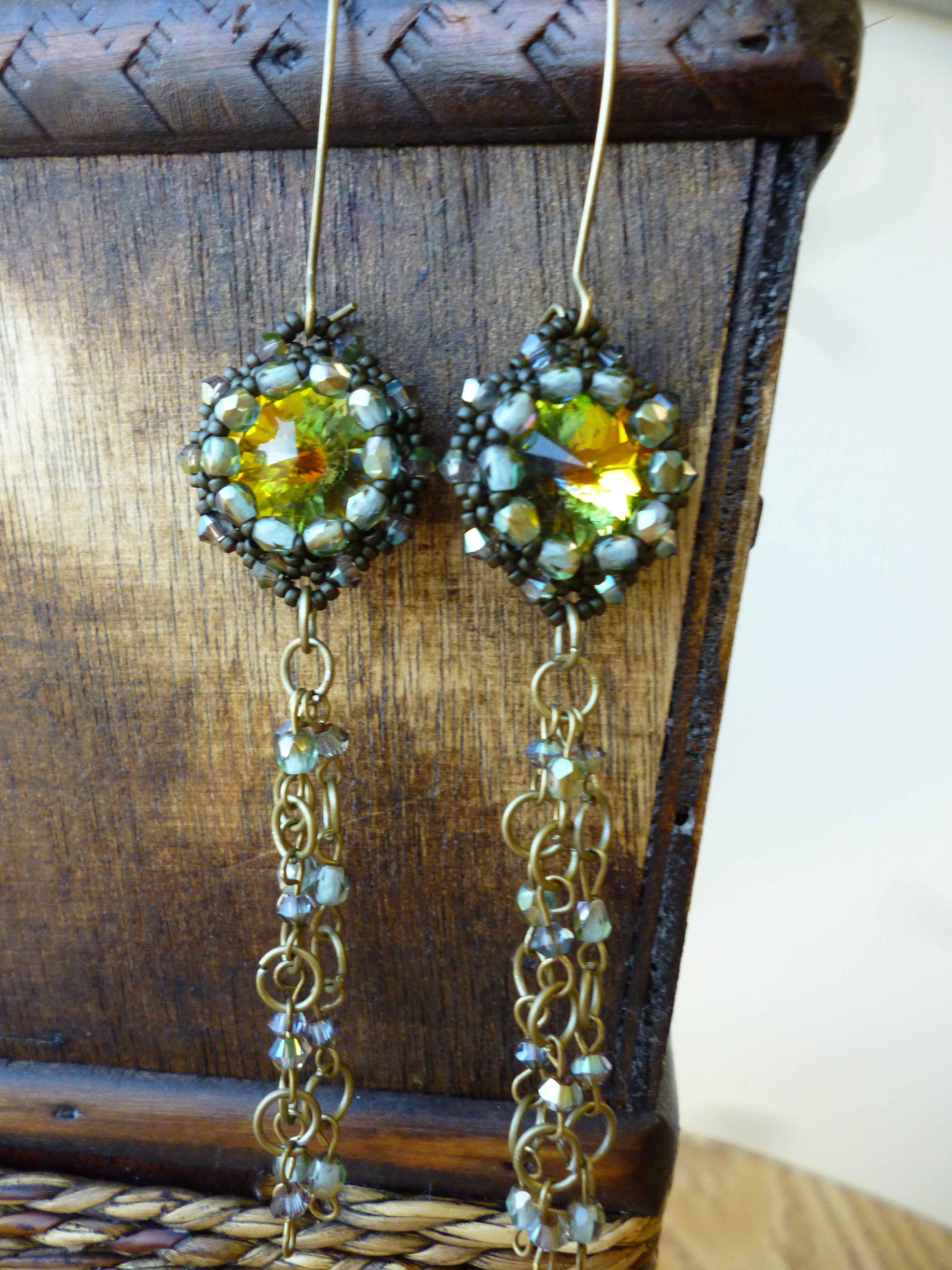 I finally decided to just dangle some antique bronze jump rings and the rest of the 3mm bicones and czech crystals that I used in the Rivoli bezel. I also attached them to long antique bronze kidney ear wires, to give them extra swing! I am really pleased with how these turned out and might make some similar ones soon.