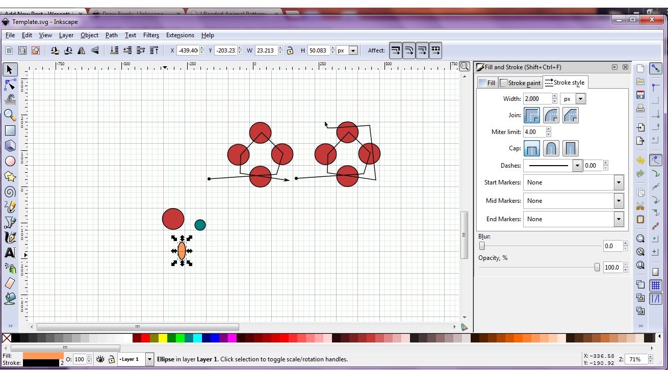 Once you download Inkscape, don’t be overwhelmed by the amount of tools and buttons. There is a lot that you can do, yes, but I personally only use two or three tools for my patterns. I learned how to use Inkscape from a wonderful beader who wrote a tutorial about how to use Inkscape specifically for writing beading patterns. It’s a long tutorial (about six pages), but she’ll show you how to get Inkscape all set up for beading designs and will walk you through the project step by step and in great detail.