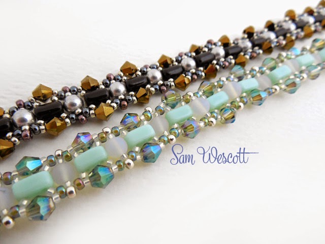 This month’s bracelet is the Follow the Rulla Brick Road bracelet (named by my dear friend Terry), which incorporates either Rulla or Czechmate Brick beads with 4mm rounds, bicones, and seed beads. The color combinations are endless. These two are currently at the Stash on display.