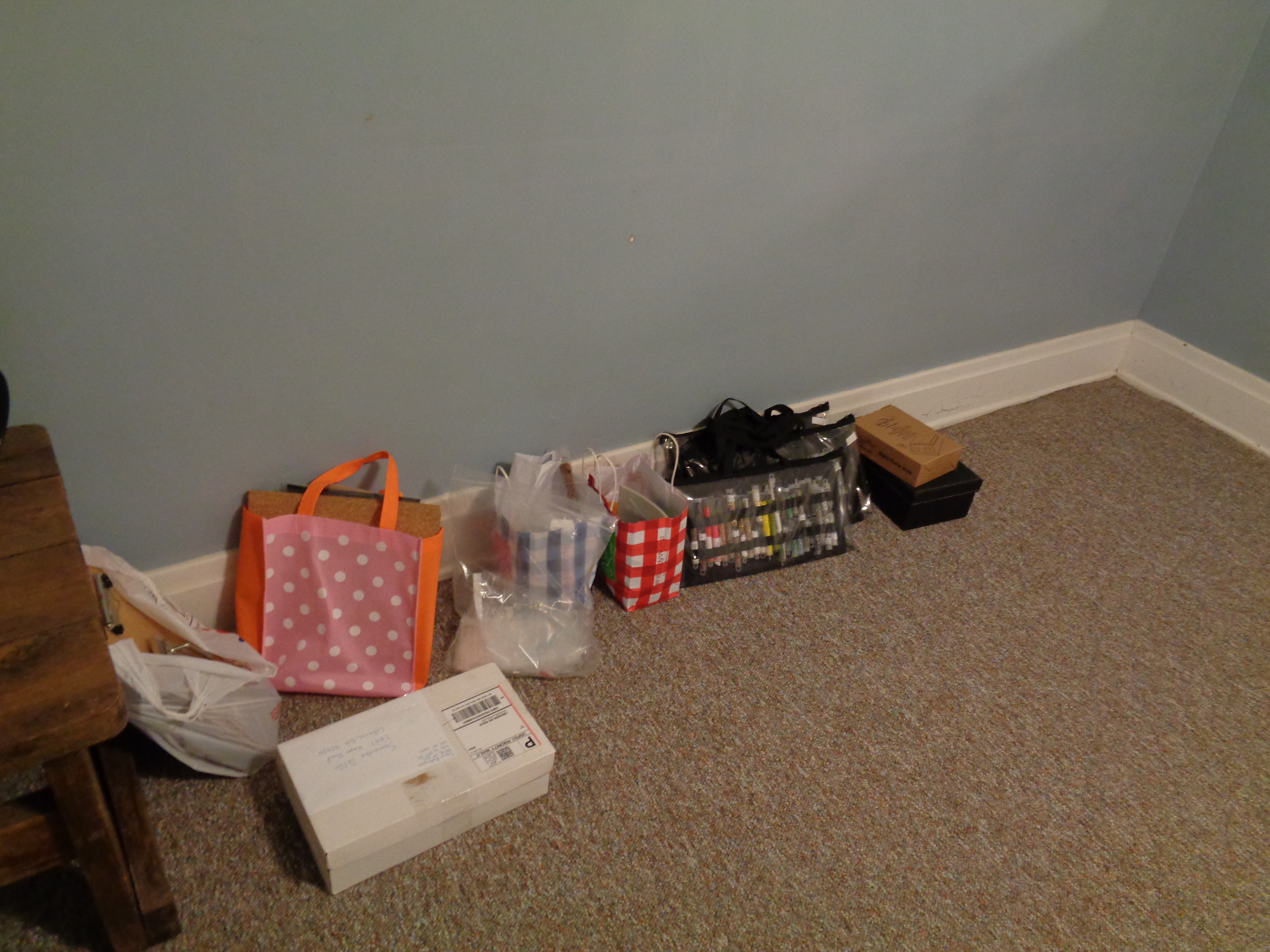 Hopefully, this floor sitting is at an end! I picked out one of the bedrooms upstairs to serve as my bead room. It has a north-facing window, so there should be some natural light in the evening when I want to bead after work. The last tenants left a dresser (wrapped in shrink-wrap for some reason?) which I am essentially using as a shelf for all my boxed and sorted beading components.