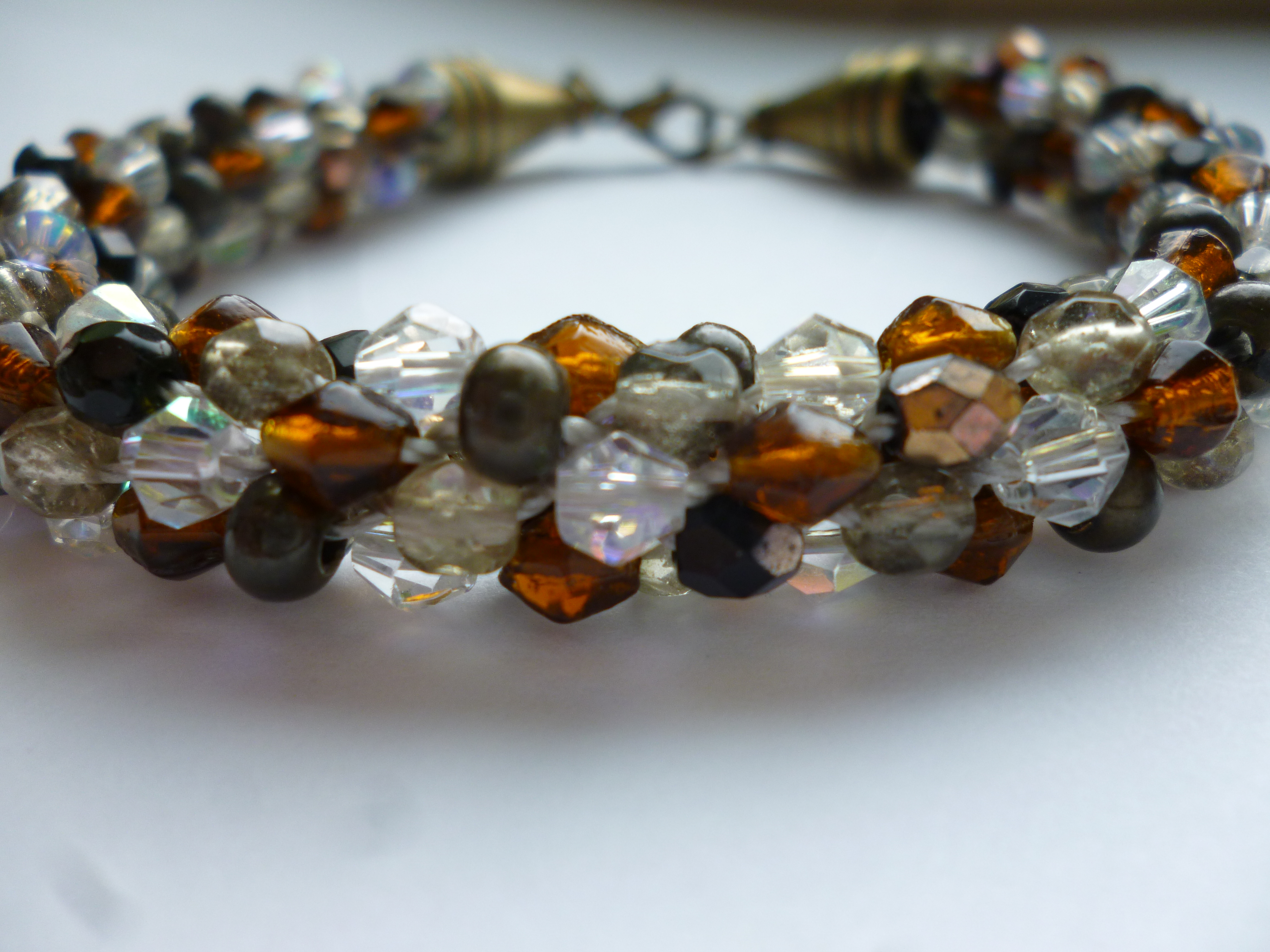 Tada! After I posted this on various and assorted facebook posts, I was surprised to receive about a bajillion questions about how I figured out the placement of my colors. For this particular necklace I did four strands of galvanized gold magatamas (three long and one short) on every other spot, and the other four spots were filled with frosted transparent rose, canary yellow picasso, yellow-lined AB, and galvanized silver.