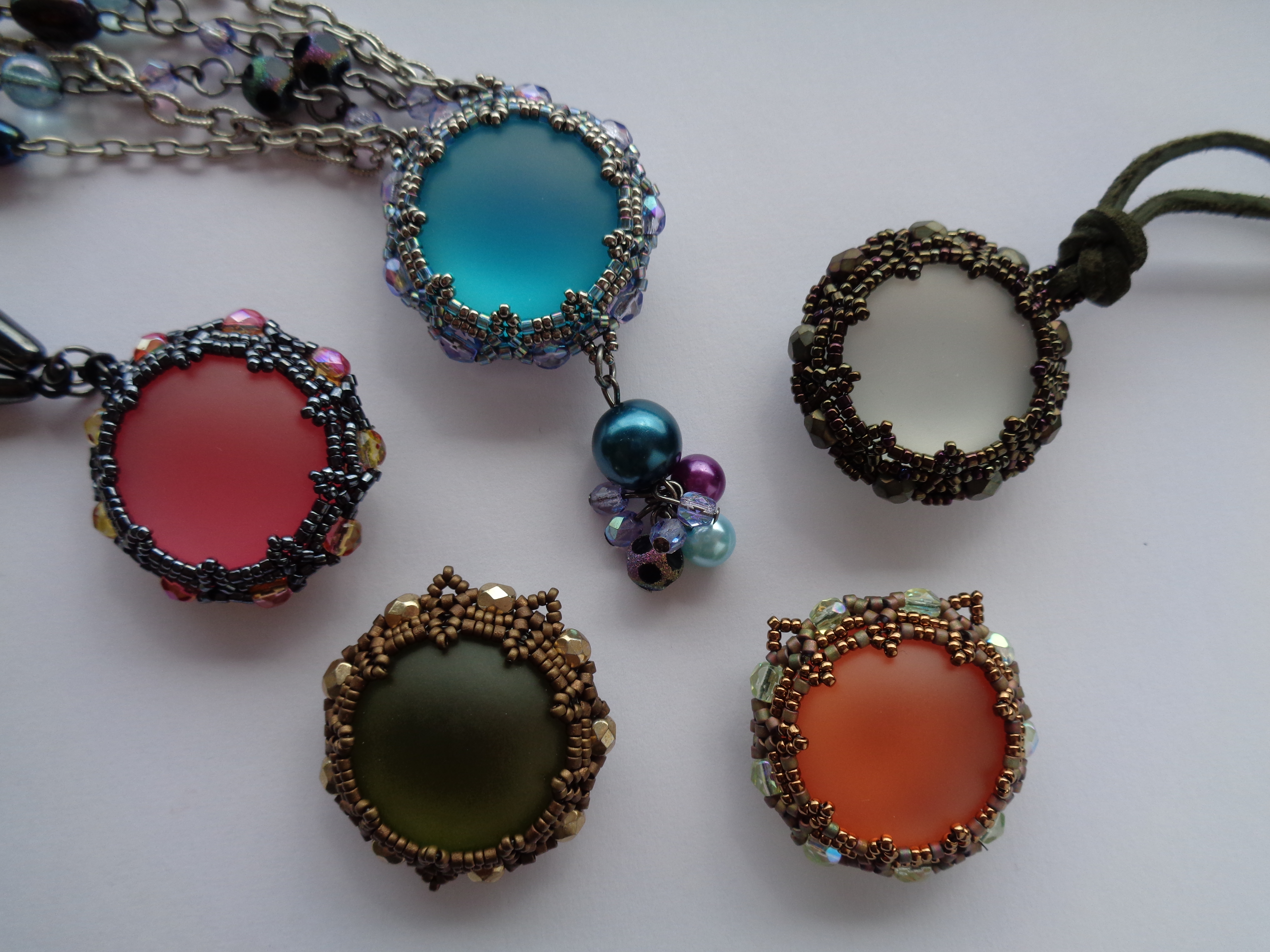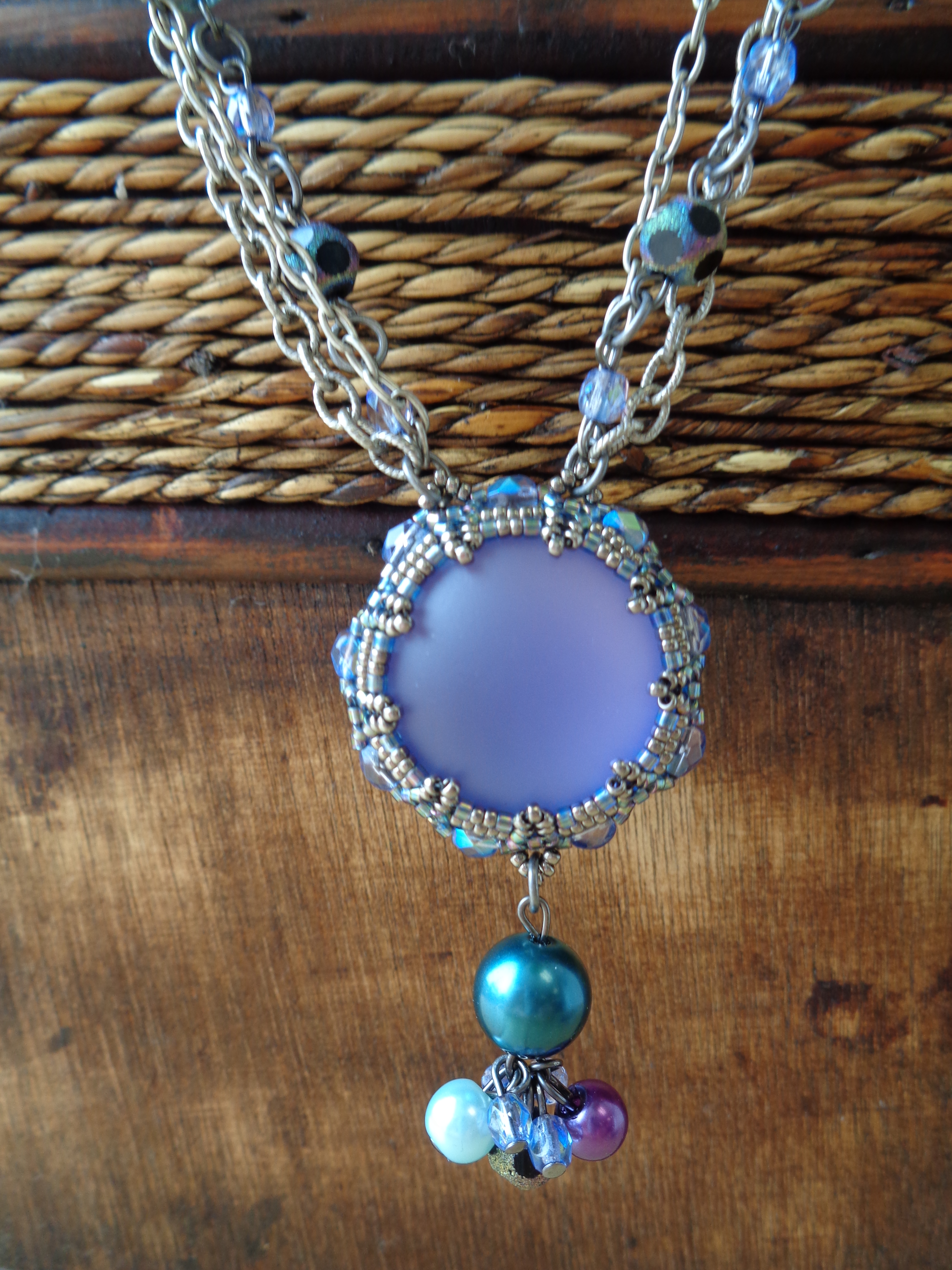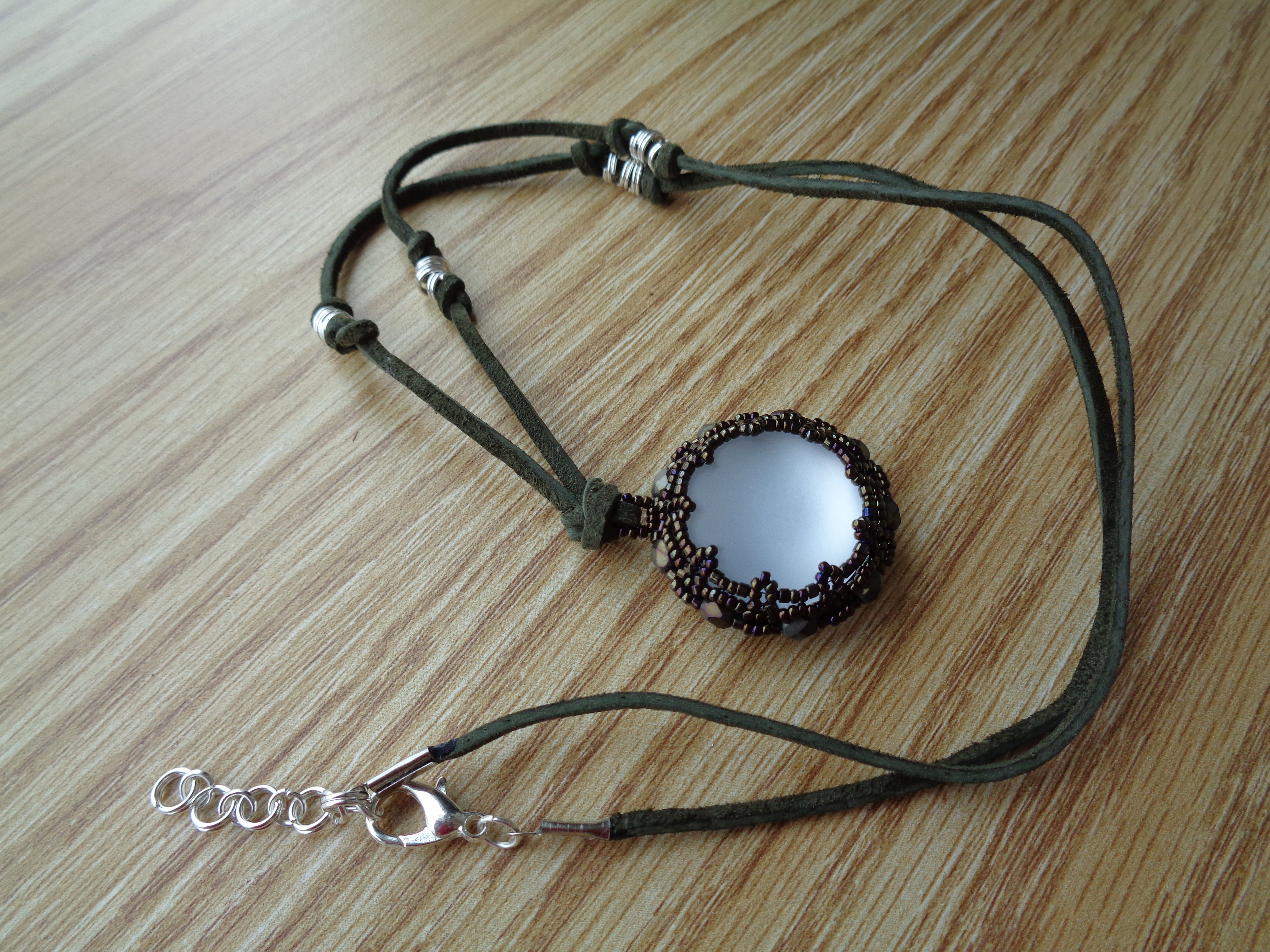 This is my new Oculus Pendant! Those two pictures are two different sides of the same pendant. The design is a bezel holding two Lunasoft cabochons together, which makes it totally reversible!