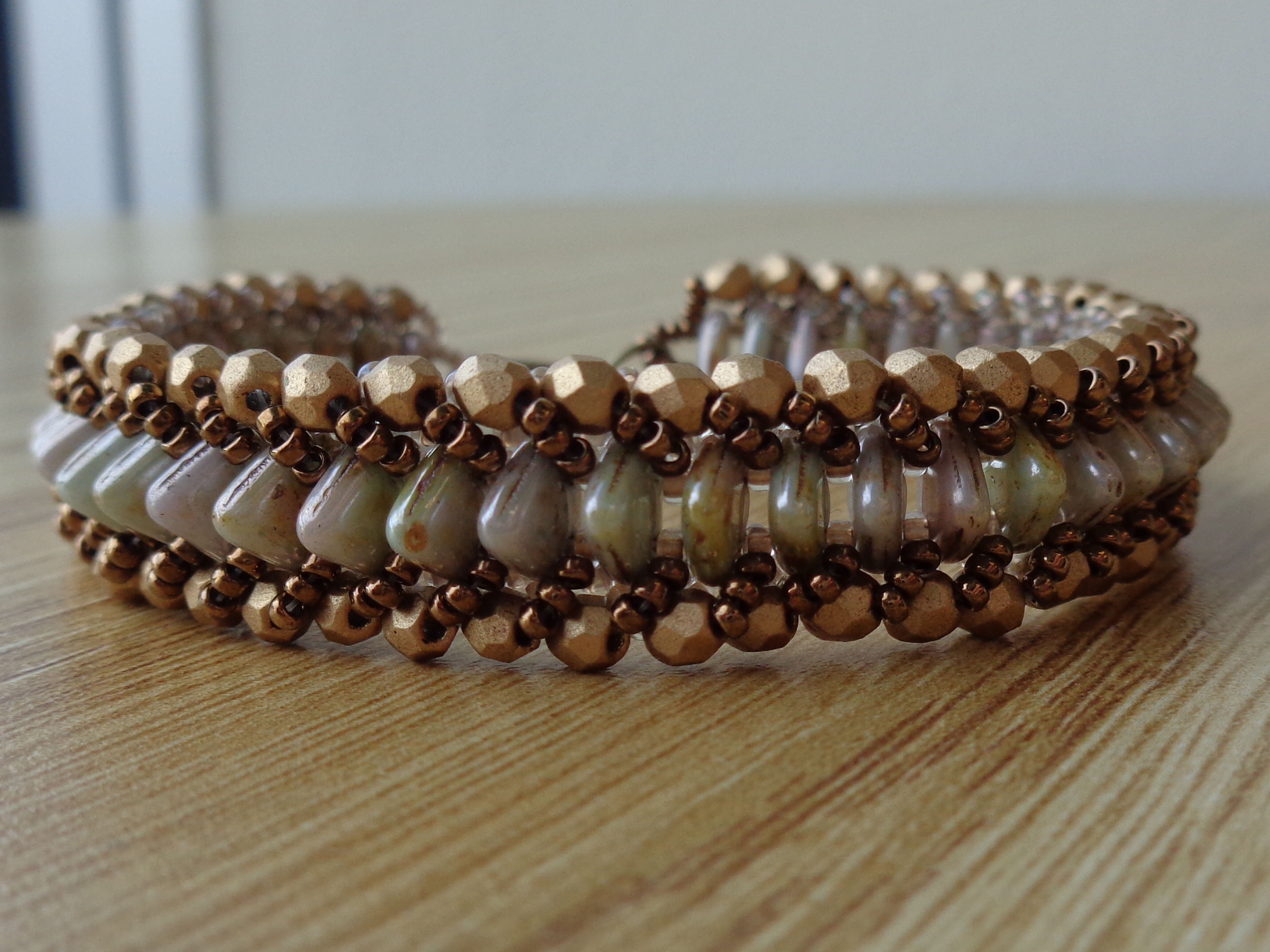 Beaded Bliss is one of my favorite bead stores in the world. I hang out there for bead night once a week and teach there as often as I can. When I was visiting a while back, Cathy (the store owner) showed me a design she had recently come up with for the two-hole triangle beads.