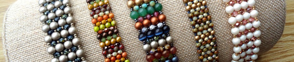 I also have two wonderful friends at my local bead shop, who tend to miniaturize my new patterns, so that they don’t overwhelm their dainty wrists. With them in mind, I decided to go ahead and try my pattern with 4mm rounds, 3mm Fire Polished crystal, and 15/0 Miyuki* seed beads. It worked and I got a mini-version! The pattern for sale includes both versions.