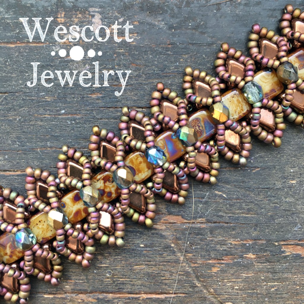 The base is made with metallic copper Kheops Par Puca beads and Picasso Brown Czechmate Tiles. I kept the seed beads simple by using both sizes in Matte Metallic Khaki Iris (one of my favorites) because I really wanted the Fire-Polished crystals to pop against all that matte. I don’t have a name for them, unfortuantely, but they’re some sort of half-metallic gold over a reflective blue AB sort of situation.