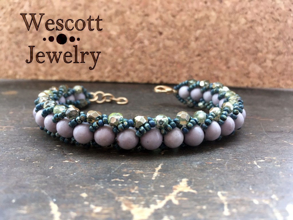 I paired them with one of my favorite Picasso seed beads – the Picasso Montana Matte 11/0’s and some half-metallic olive fire-polished crystals. I really liked the color combination and the slight irregularity of the beads didn’t affect the flat spiral too much.