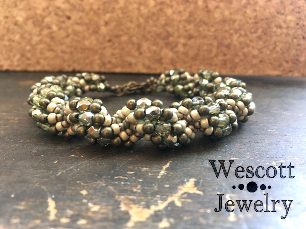 After I finished that bracelet, I really wanted to use up the rest of those half-metallic olive fire-polished crystals. Since rediscovering the flat spiral had been so satisfying, I was inspired to return to another old favorite – the classic spiral. Spiral stitch is another one of my favorites because, again, you can adjust it to include so many different types of beads and you don’t have to rely on any specialty shapes. That versatility is addictive.