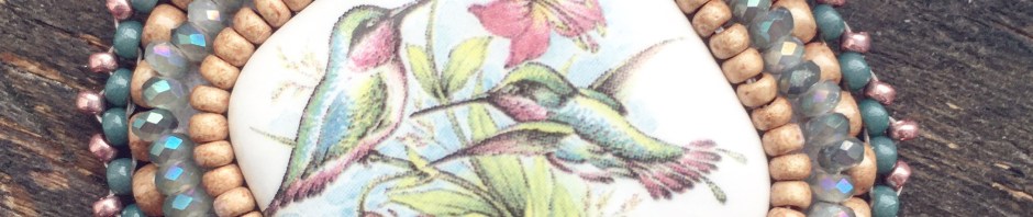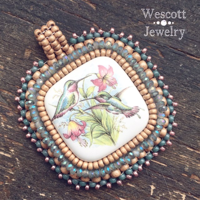 And, like some sort of miracle, I had exactly enough of the crystal rondelles to frame this Hummingbird tile that I have been wanting to embroider for the longest time. I got this tile from the secondhand consignment section of Bead Stash near Dayton, OH before it closed, so I have no way of getting more and no information on who made it or where it came from. But I was absolutely delighted to use up all my rondelles on this little pendant.