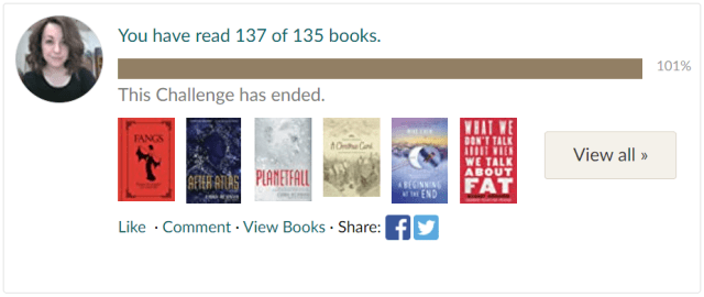 I’m happy to start with the easy one here. I pretty much always make my reading goals because I have the privilege of working at Beads Direct USA in a type of job where I can have my headphones in almost all day. While the long list of podcasts I listen to definitely bit into my audiobook time this year, I still managed to read and review 137 books and discovered a whole bunch of new favorites.